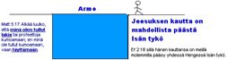 Armon vastaanottaminen. Kun edellä on jo todettu, että Jeesus on täyttänyt kuilun Jumalan ja ihmisten välillä sekä tullut välimieheksemme (Hebr 9:15 Ja sentähden hän on uuden liiton välimies, että… ne, jotka ovat kutsutut, saisivat luvatun iankaikkisen perinnön.), on hyvä ymmärtää, että myös vain hänen kauttaan voidaan pelastua. Vain hänen puoleensa kääntymällä ja hänen kauttaan voimme saada syntien anteeksiantamuksen, koska hän on jo tehnyt kaiken puolestamme. Käänny sen tähden hänen puoleensa, niin sinäkin saat Jumalan armon ja anteeksiannon osaksesi:
